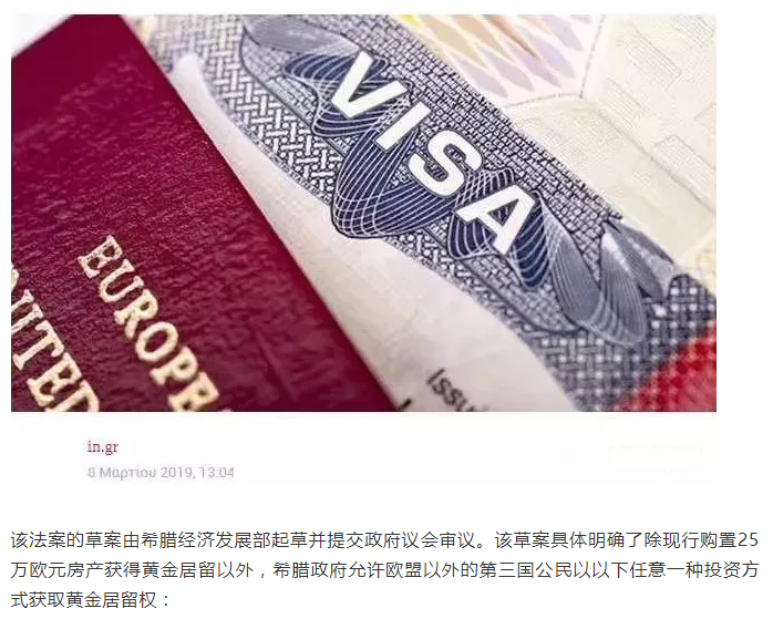希腊黄金签证计划投资范围正式盖章拓宽!计划于2019年6月中旬开始正式实施,将允许外国人可通过投资债券、股票或银行存款等方式获得5年长期黄金签证。在此之前,只能通过购买25万欧元以上房产获取居留权。