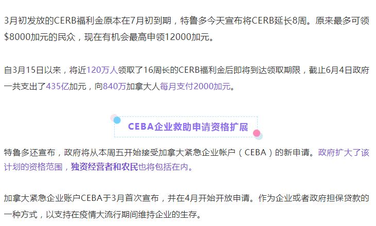 杜鲁多周二宣布将每月$2000加元CERB救济福利延长8个星期至夏季结束,原来最多可领8000加元的民众现在有机会最高申领12000加元,安心宅家抗疫。